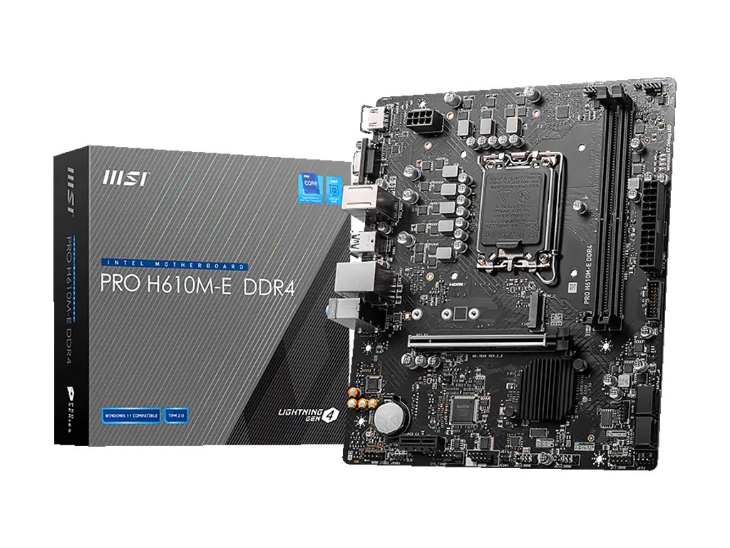MSI PRO H610M-E DDR4 je spolehlivá a cenově dostupná základní deska ve formátu Micro-ATX, navržená pro procesory Intel 12. a 13. generace (socket LGA1700). Deska podporuje paměti DDR4 ve dvou slotech (až 64 GB), nabízí přípojky PCIe 4.0 pro grafickou kartu a M.2 slot pro rychlé NVMe SSD úložiště. Díky kompaktním rozměrům se hodí i do menších skříní.